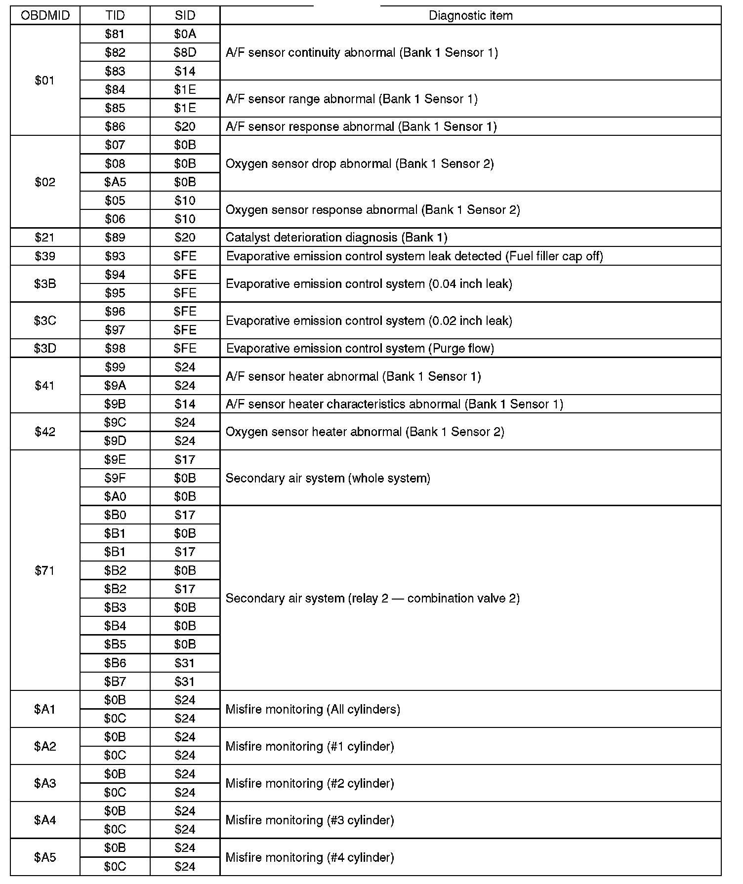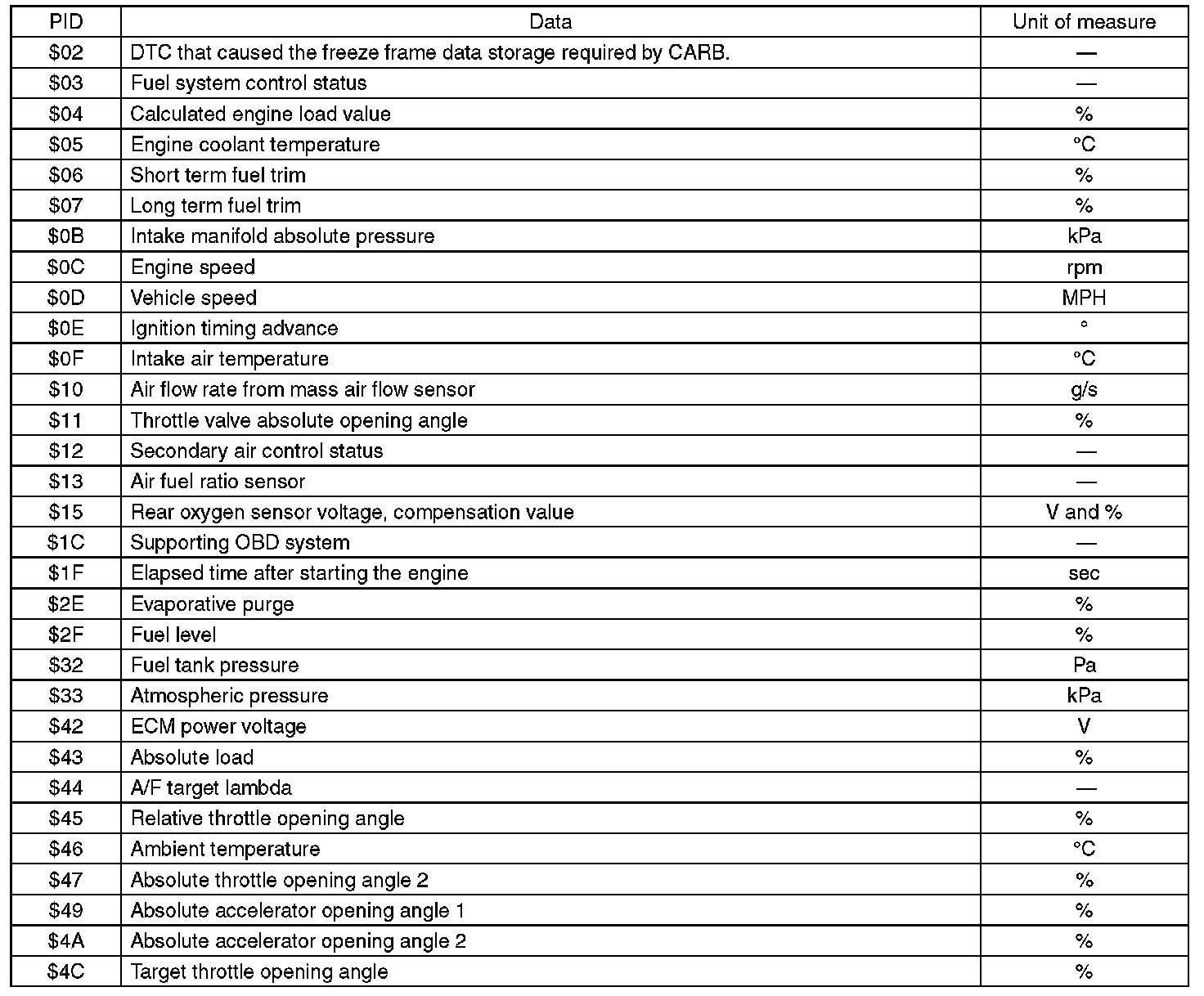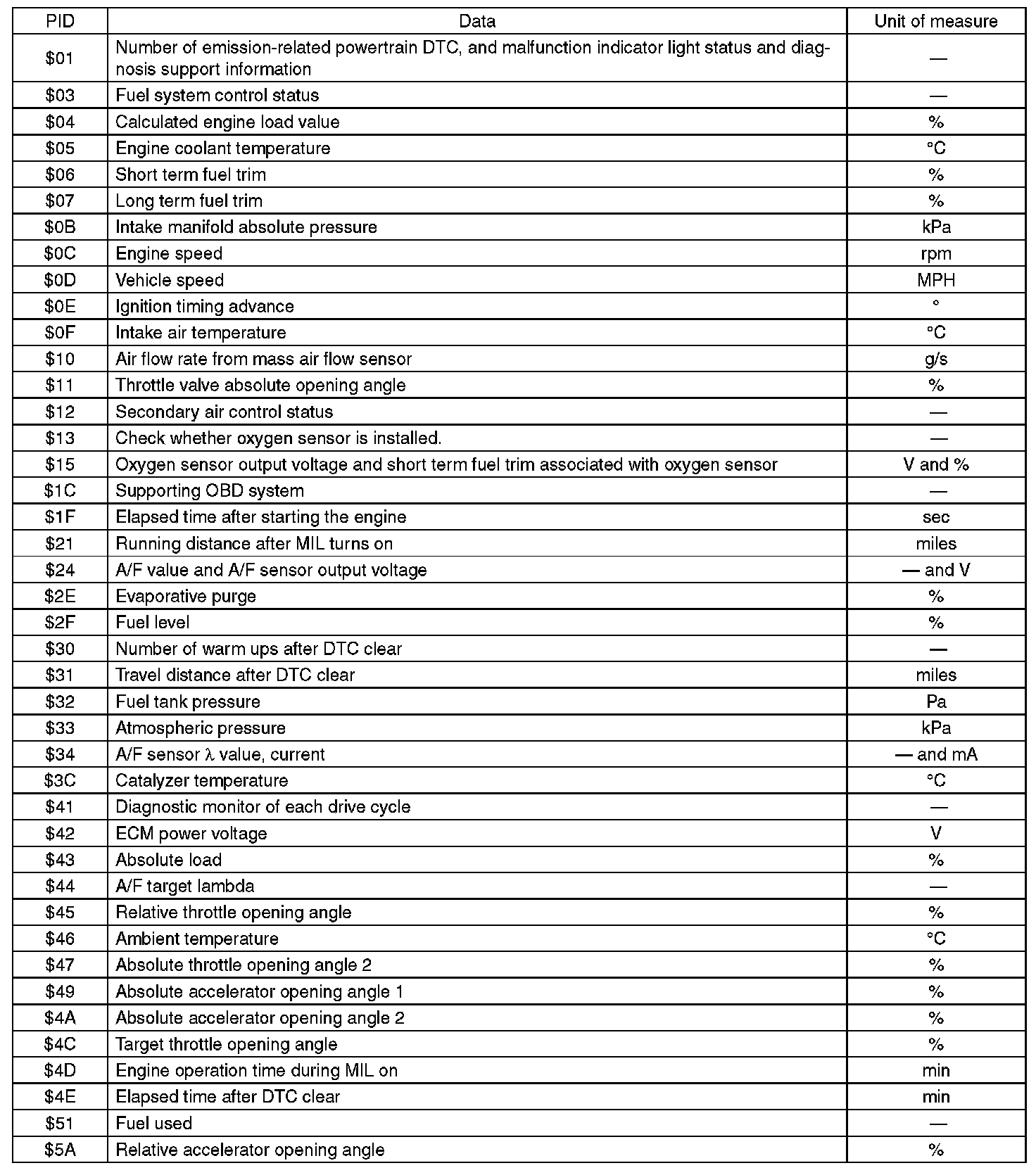 A list of the support data and PID (Parameter Identification) codes are shown in the following table.