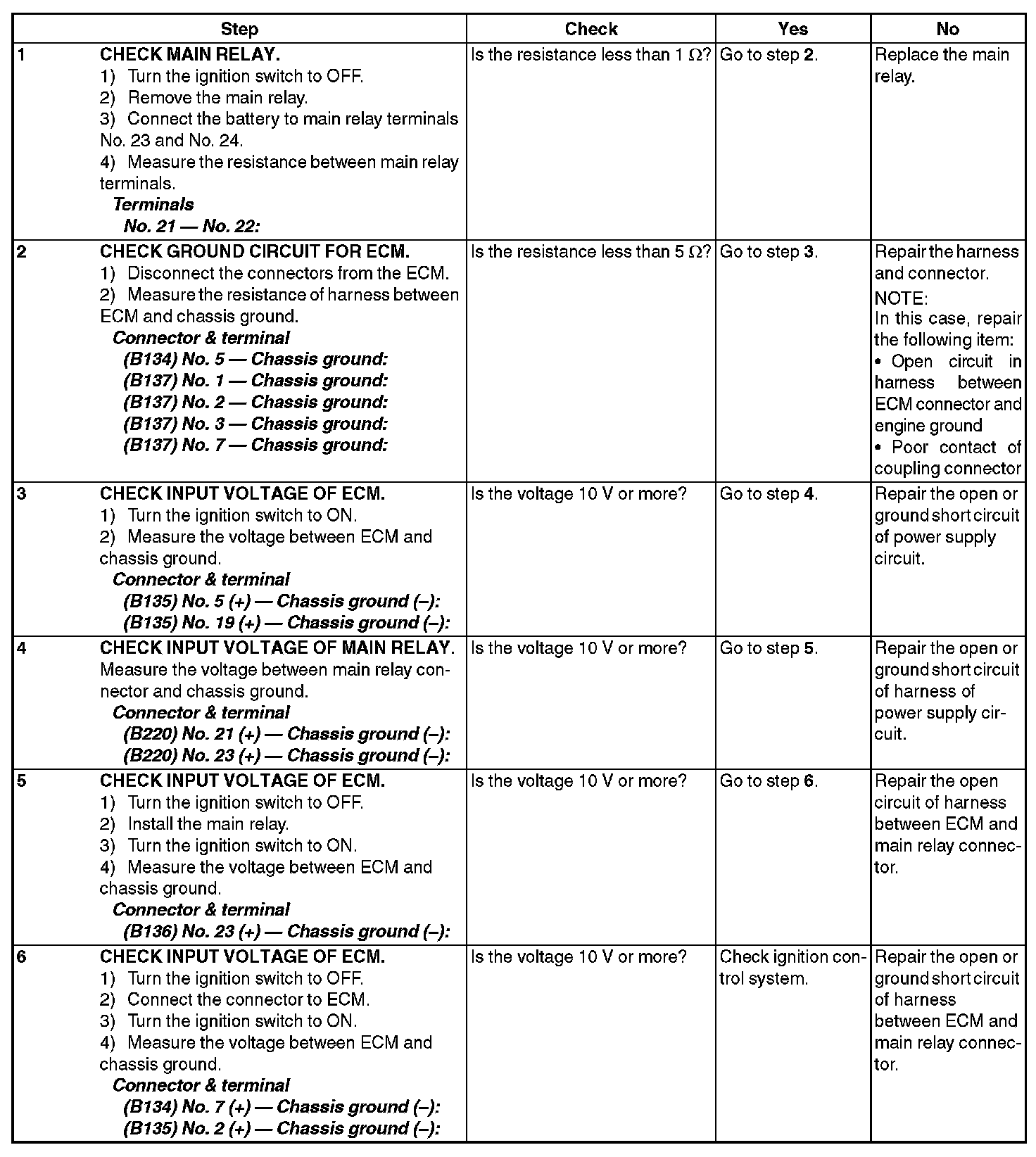 CHECK POWER SUPPLY AND GROUND LINE OF ENGINE CONTROL MODULE (ECM)CAUTION: After repair or replacement of faulty parts, perform Clear Memory Mode. Clear Memory Mode and Inspection Mode. Preparation For the Inspection Mode