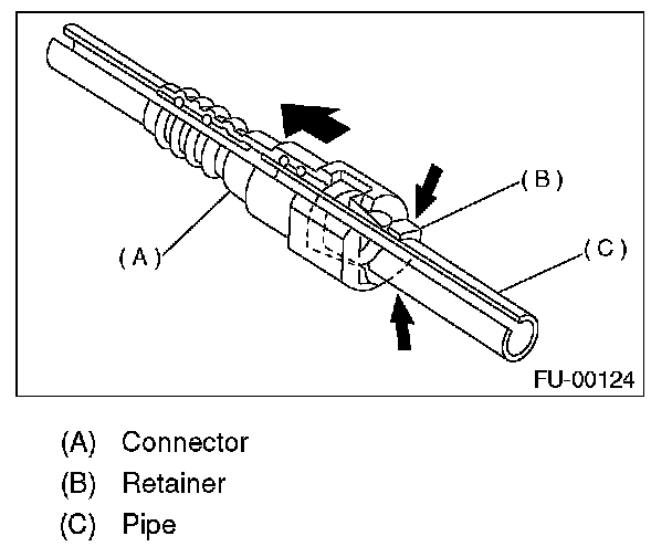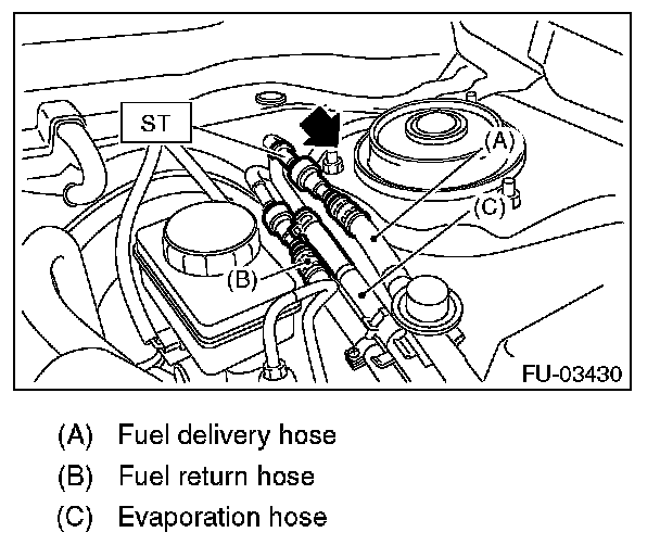 1. Disconnect the quick connector on the fuel delivery line and return line by pushing the ST in the direction of the arrow.