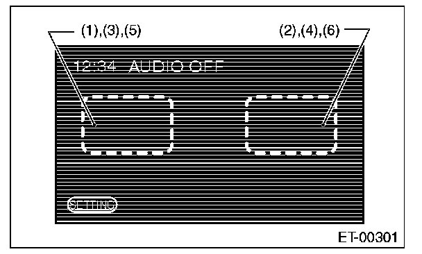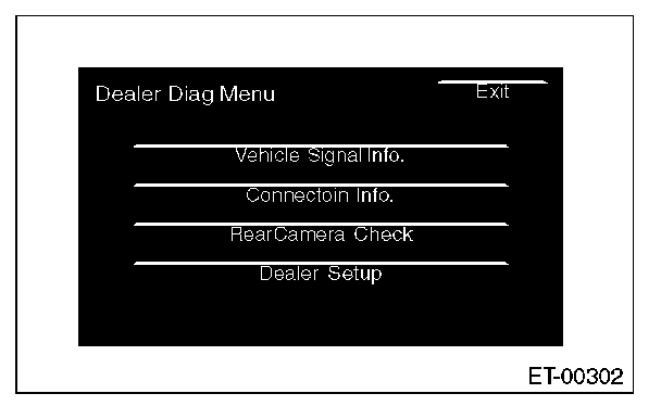 > key. When a screen other than the opening screen is displayed, press the <> key. Standard value: The map screen should be displayed. OK: Normal NG: If the map screen is not displayed, the following causes are possible. - The DVD-ROM is not set in the navigation system unit. - The DVD-ROM is inserted with its wrong side. - The type of DVD-ROM is wrong. - The DVD-ROM has scratches etc. If there are no problems on the DVD-ROM, the main body is defective. 3. CHECK EACH CONNECTION If there are no problems in "CHECK THE OPERATION OF THE NAVIGATION" and "CHECK THE DVD-ROM" above, check the circuit of the navigation system . NAVI-01 4. SWITCHING TO CONNECTION INSPECTION MODE 1. Press <> key to display the AUDIO OFF screen. 2. Touch the screen in the order of (1) to (6) shown in the figure. 3. The display will switch to the Dealer Diag Menu screen. - CHECK THE GPS ANTENNA NOTE: When checking the GPS antenna, perform the check operation outdoors to improve the receiver sensitivity. 1. Touch {Vehicle Signal Info.} on the <> screen. 2. Check that "Connect" is displayed in the GPS Antenna item. Connect: Normal. NC: Abnormal. Check the GPS antenna connection. - CHECK THE BACK SENSOR NOTE: Before starting inspections, check the safety around the rear end of the vehicle and then turn the ignition switch to ON. 1. Touch {Vehicle Signal Info.} on the <> screen. 2. Pull the parking brake and depress the brake, then put the gear in reverse. 3. Make sure that "ON" is displayed in the Reverse item. ON: Normal. OFF: Abnormal. Check the signal line connection. If there are no problems, the unit could be faulty. - CHECK THE ILLUMINATION NOTE: Before starting inspections, turn the ignition switch to ON. 1. Touch {Vehicle Signal Info.} on the <> screen. 2. Turn the lighting switch to level 1. Make sure that the bright switch is not turned ON at this time. 3. Make sure that "ON" lights in the Illumination item and then the screen fades out. ON: Normal. OFF: Abnormal. Check the signal line connection. If there are no problems, the unit could be faulty. - CHECK SPEED SENSOR NOTE: - Before starting inspections, check the safety around the vehicle. - Lift up the vehicle as necessary. - When the diagnostic trouble code is input in the VDCCM, perform the Clear Memory operation. 1. Touch {Vehicle Signal Info.} on the <> screen. 2. Move the vehicle 2 to 3 meters (6.6 to 9.8 ft) . 3. Check that "ON" is displayed in the Speed item. ON: Normal. OFF: Abnormal. Check the signal line connection. If there are no problems, the unit could be faulty.