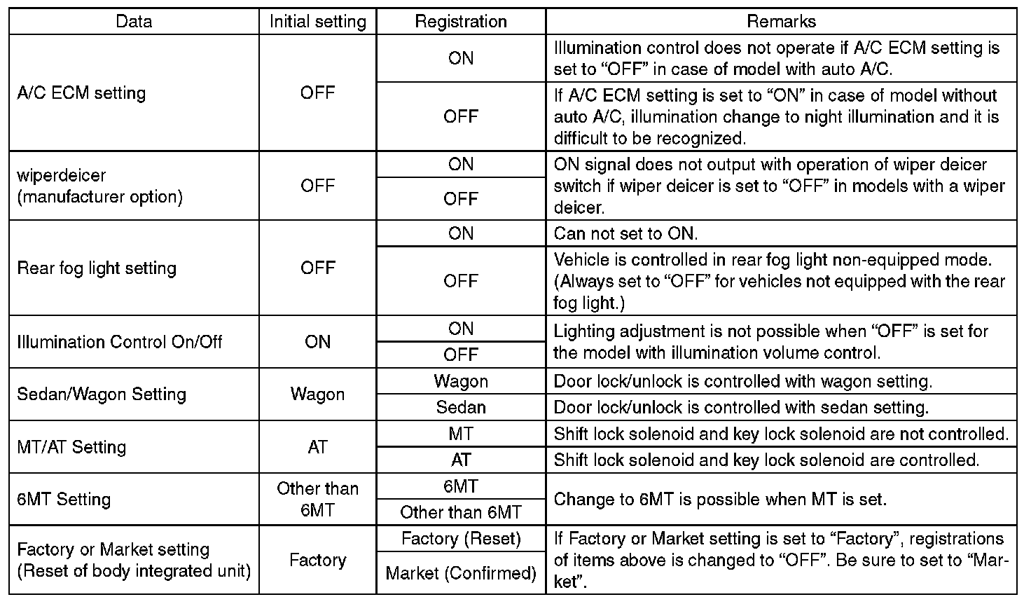 - Be sure not to change Factory or Market setting except installation of new body integrated unit.