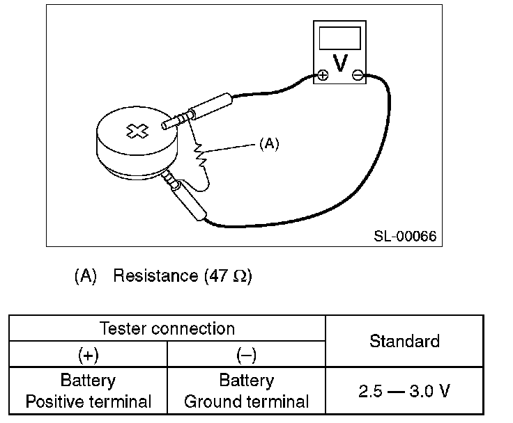 Measure the voltage between the keyless transmitter battery (+) terminal and (-) terminal.