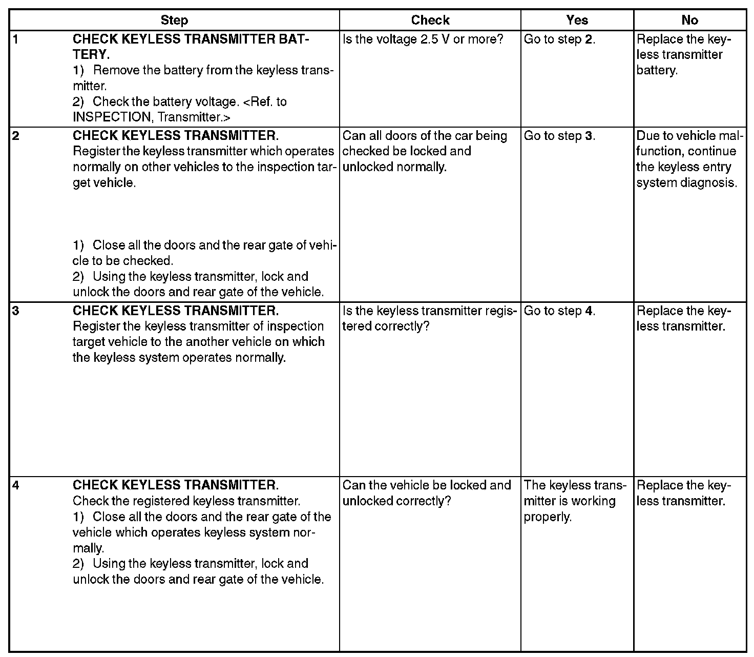 CAUTION: Be sure to reset keyless transmitters from other vehicles that were registered to the inspection target vehicle, and the vehicle to which keyless transmitters were registered for the inspection, to the condition before performing the inspection. (Register the keyless transmitters again.)