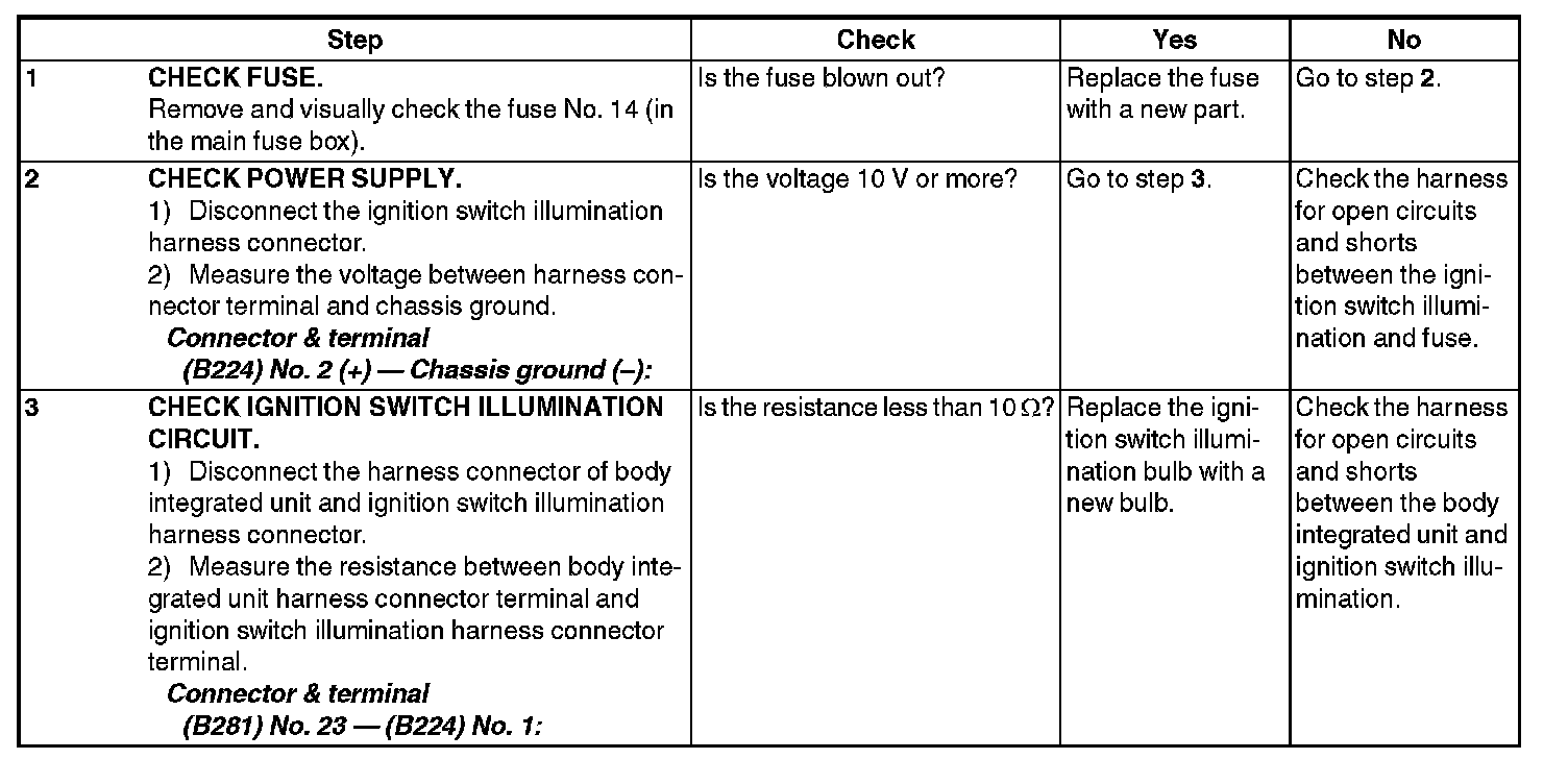 11. CHECK IGNITION SWITCH ILLUMINATION