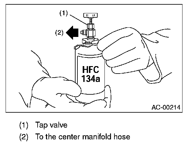 18. If the HFC-134a supply container becomes empty, close all valves, and close the can tap valve to replace the empty container. After replacing the HFC-134a supply container with a new container, air purge first, then restart the filling procedure.