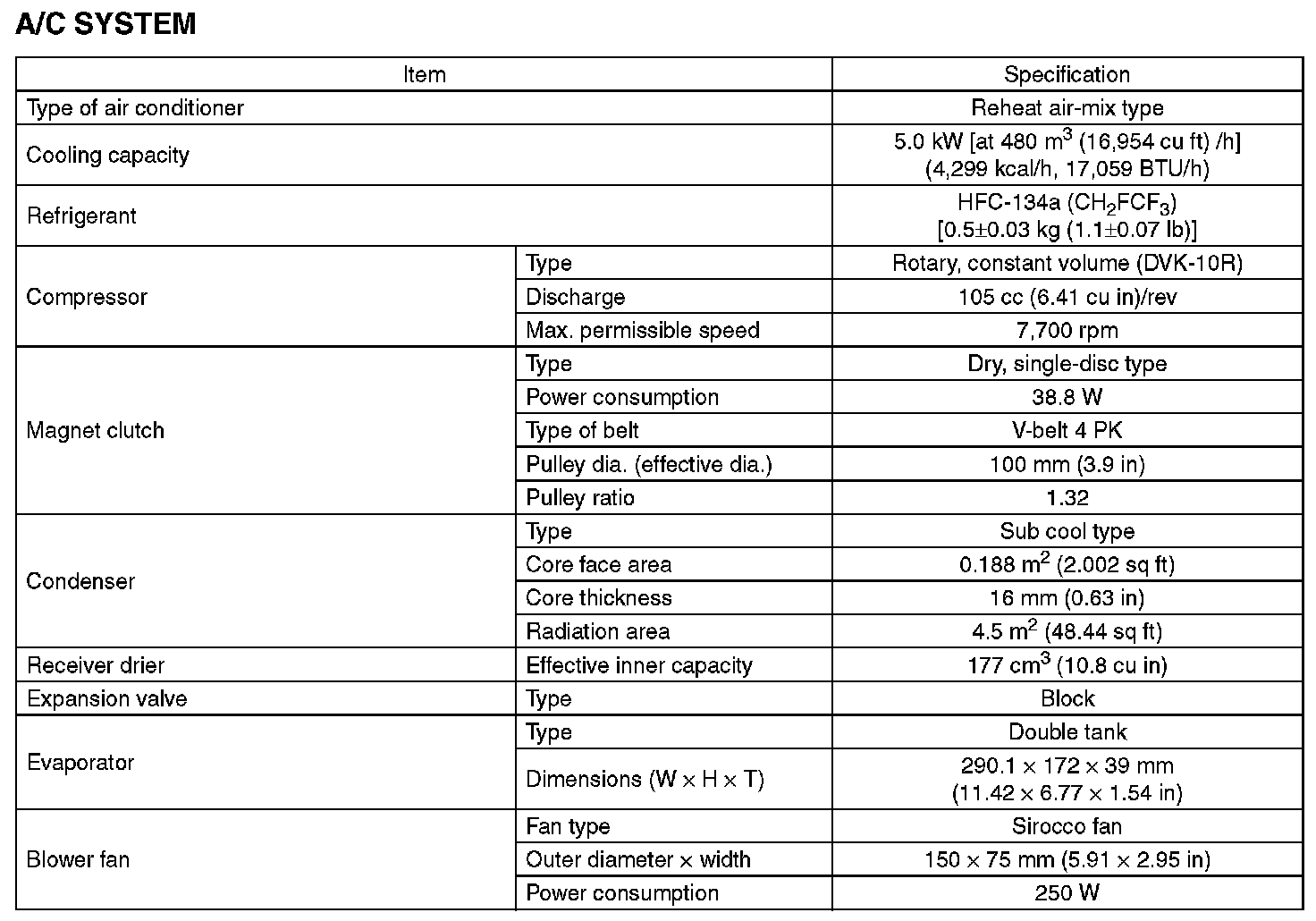 Specification - A/C System (Part 2):