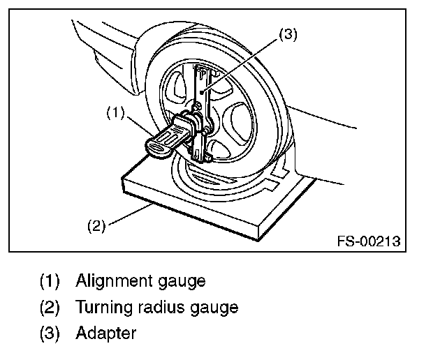 1) Place the front wheel on the turning radius gauge. Make sure the ground contact surfaces of the front and rear wheels are at the same height.