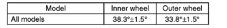 2) While depressing the brake pedal, turn the steering wheel fully to the left and right. With the steering wheel held at each fully turned position, measure both the inner and outer wheel steering angles.