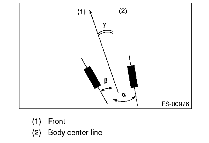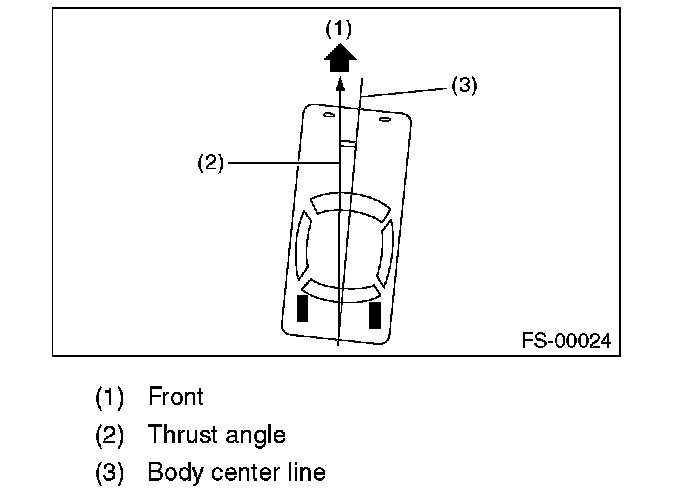 Thrust angle is a mean value of left and right wheel toe angles in relation to the vehicle body center line. Vehicle is driven straight in the thrust angle direction while slanting in the oblique direction depending on the degree of the mean thrust angle.