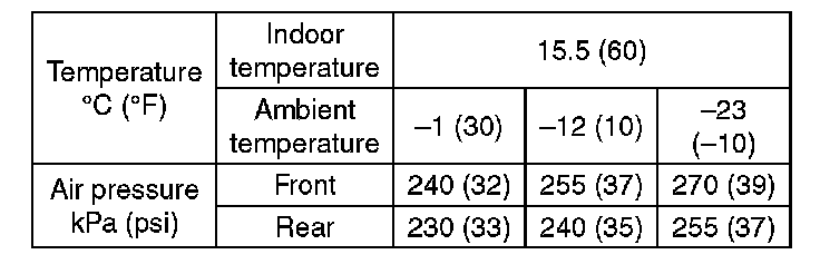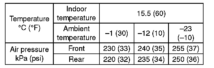 ^ When adjusting tire pressure indoors in winter, there is a big temperature difference between the indoor facilities and outside. Once the car is outside where the temperature is lower, the air pressure in the tires will drop, causing the tire pressure warning light to illuminate, even if the pressure in the tires was adjusted to standard values indoors. To avoid this, it is necessary to adjust the tire pressure to the high side in consideration of the difference in temperature between inside and outside according to the following table.