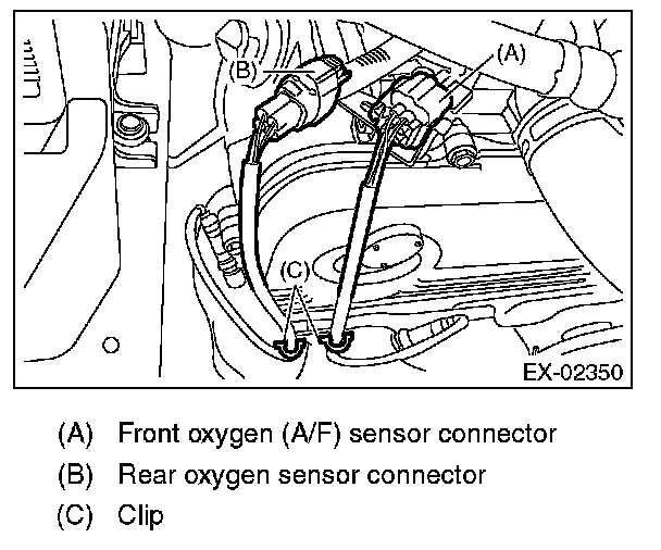 4. Remove the clip fastening the harness and disconnect the front oxygen (A/F) sensor connector.