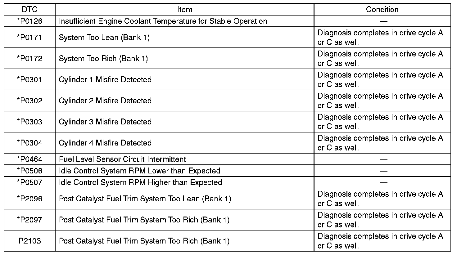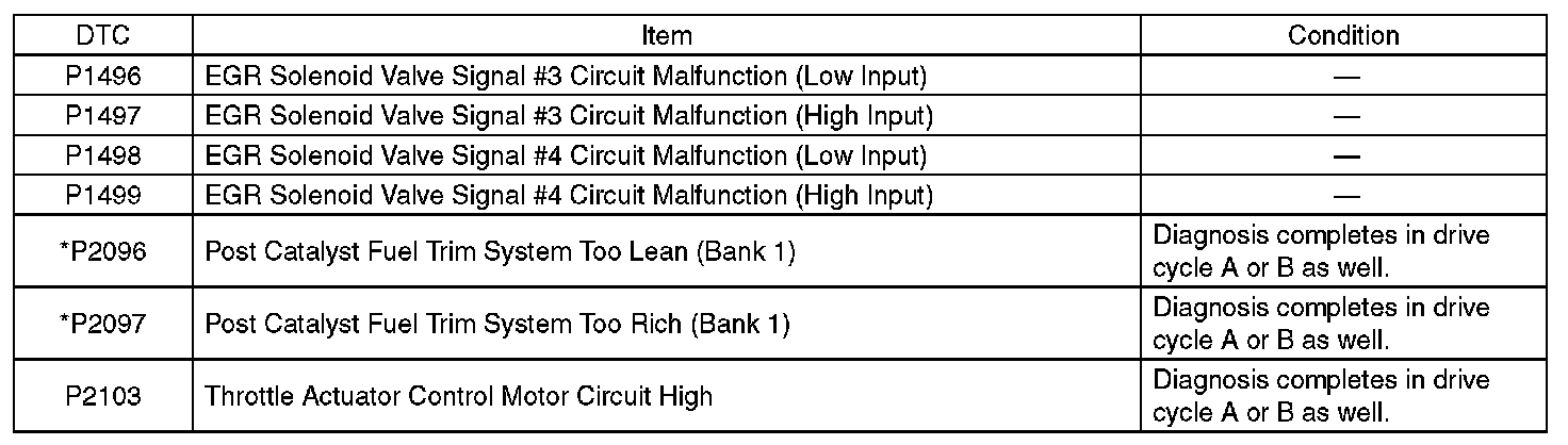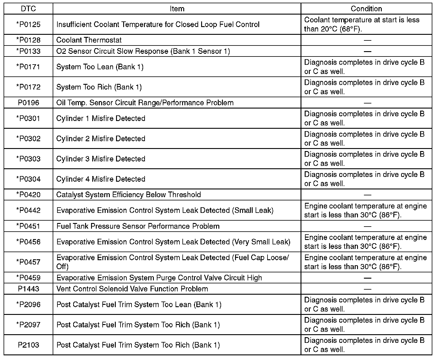 - Perform the diagnosis twice if the DTC marked with *. After completing the first diagnosis, stop the engine and perform second diagnosis in same condition.