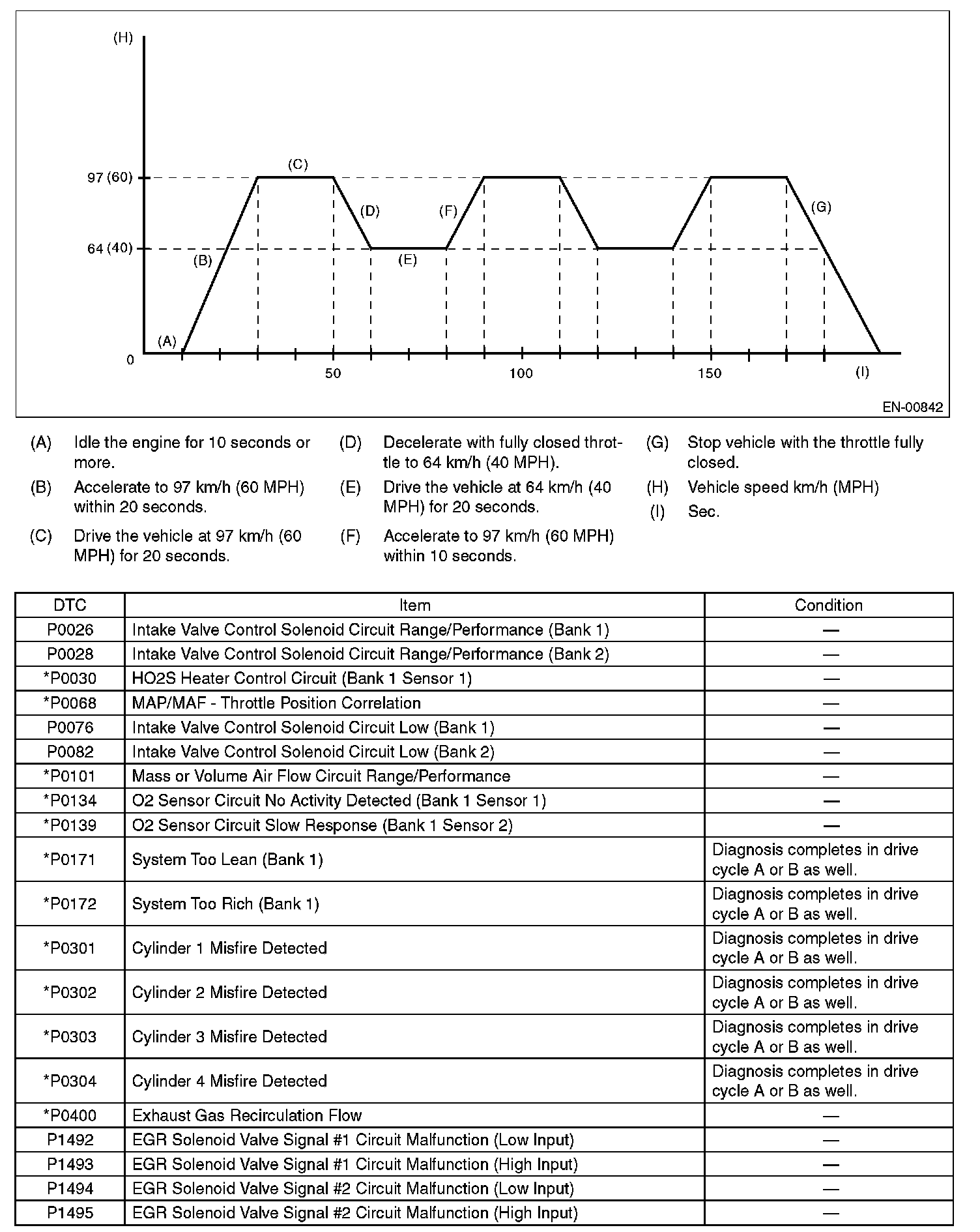 For the troubleshooting, there are driving patterns described below. Driving in the specified pattern allows to diagnose malfunctioning items listed below. After the repair of the following trouble items, be sure to drive the vehicle with the specified drive patterns to check whether the function is resumed correctly.