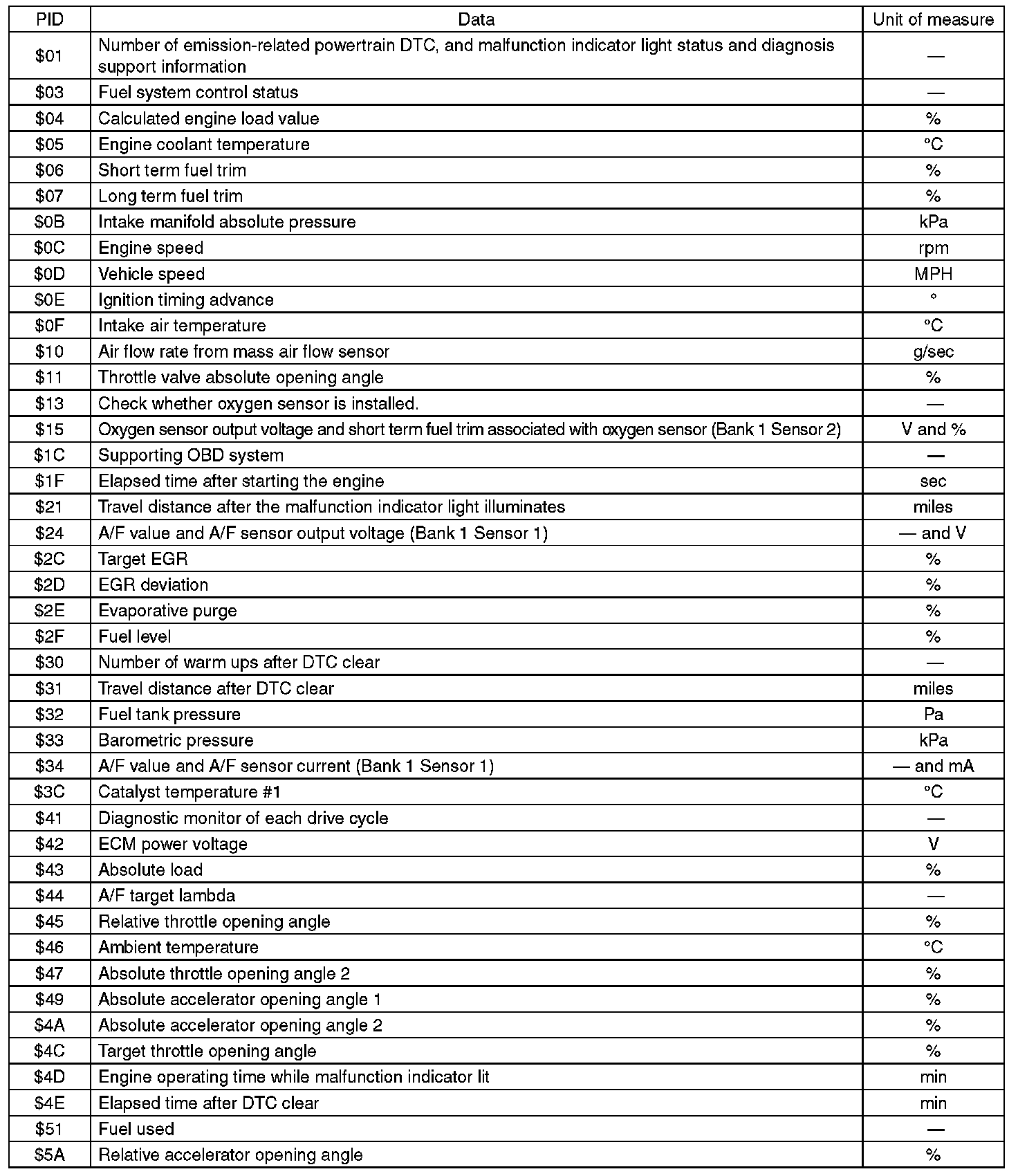 A list of the support data and PID (Parameter Identification) codes are shown in the following table.