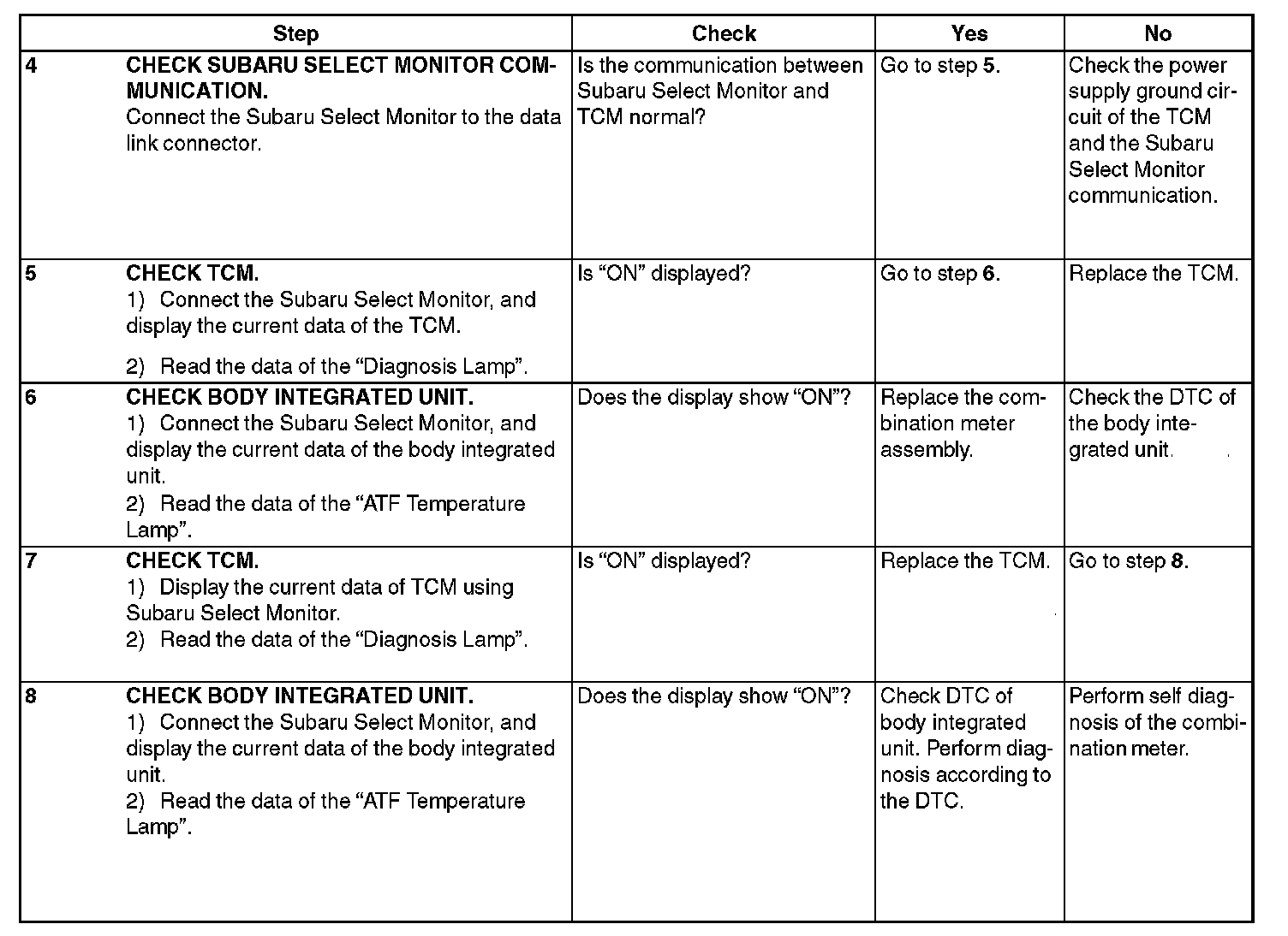 If there is a malfunction with an on-board diagnosis part, the ATF temperature warning light will flash. The flashing will continue from when the malfunction is confirmed after starting the engine, until the ignition switch is turned to OFF. The malfunctioning part or unit can be identified by DTC during the on-board diagnostics operation. Problems which occurred previously can also be identified through the memory function. If the ATF temperature warning light does not show a problem (although a problem is occurring), the problem can be determined by checking the performance characteristics of each sensor using the Subaru Select Monitor. The ATF warning light signal patterns are shown in the figure.