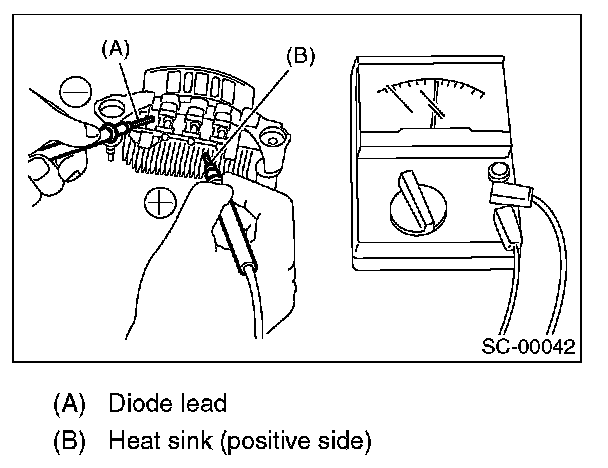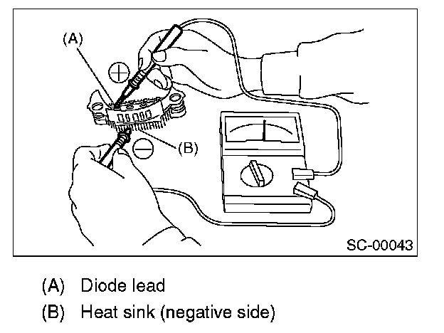 Check for continuity between the negative side heat sink and diode lead. If resistance is 1 ohm or less only in the direction from the heat sink to the diode lead, the negative diode is OK.