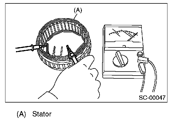 Inspect the continuity between the stator coil stator core and lead wire terminals. If the resistance is 1 ohm or less, the stator coil is grounded. Replace the stator assembly.