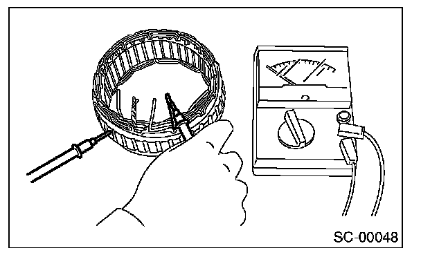Using a circuit tester, check the resistance between slip rings.
