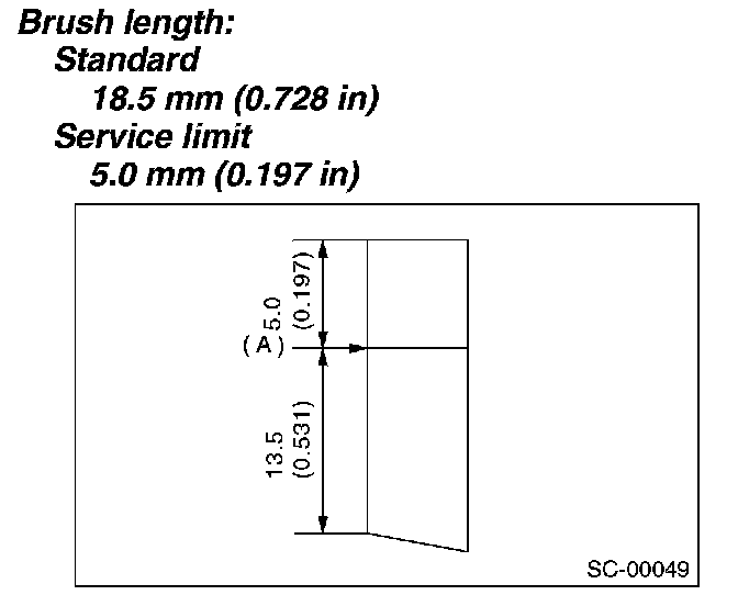 1. Measure the length of each brush. Replace the brush if wear exceeds service limits. There is a service limit mark (A) on each brush.