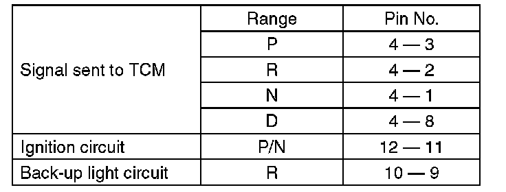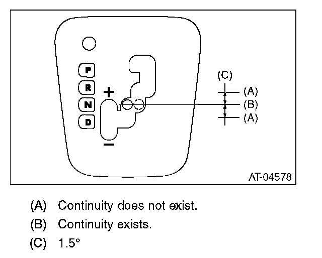 3) Check that there is continuity at equal points when the select lever is moved 1.5° in both directions from the "N" range. If there is continuity in only one direction or in other points, adjust the inhibitor switch.