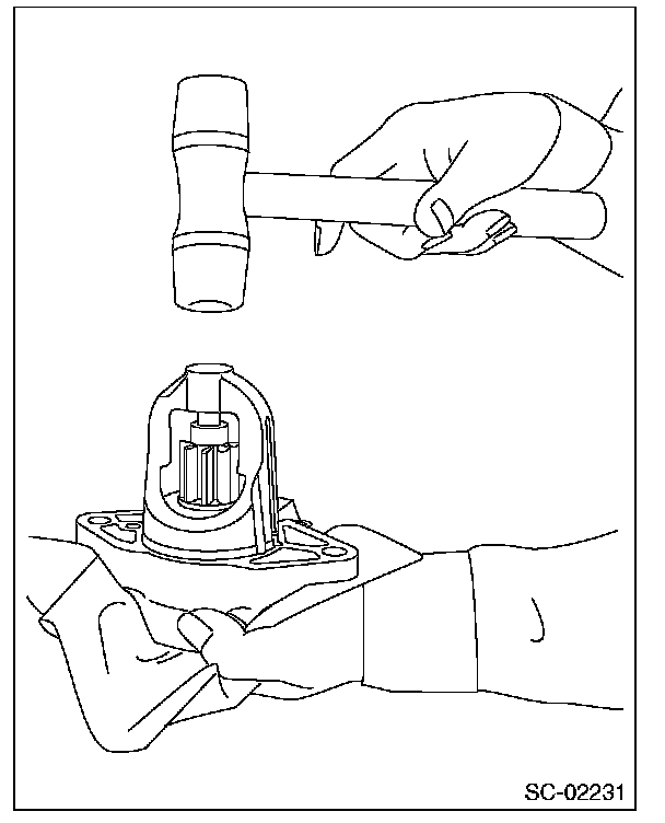 9. Lightly tap the starter housing assembly with a plastic hammer as shown in the figure, and remove the overrunning clutch, internal gear assembly, shaft and shift lever together as one piece.