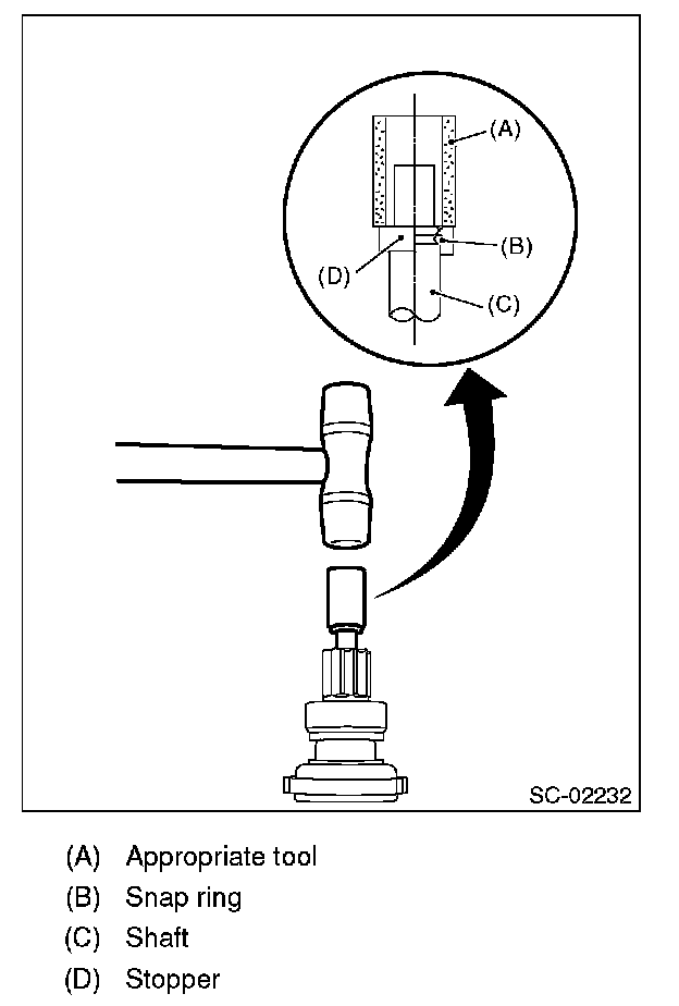 2. Remove snap ring (A) from the shaft, and remove stopper (B).