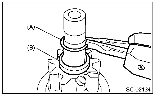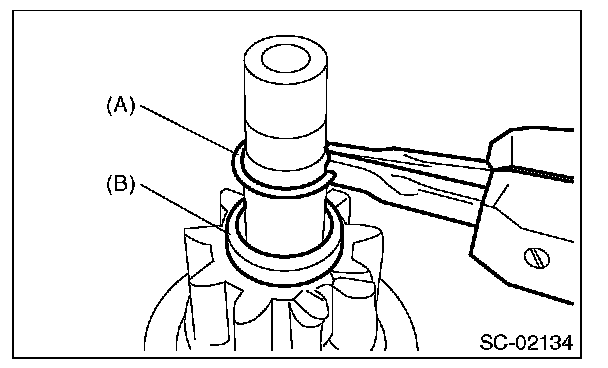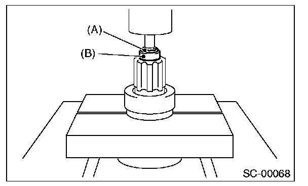 4. Using a press, pressure fit stopper (B) into snap ring (A).