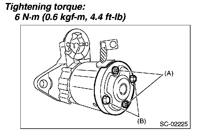 3. Remove screws (A) of the brush holder assembly, and through bolts (B) on both sides, and remove the starter cover assembly.