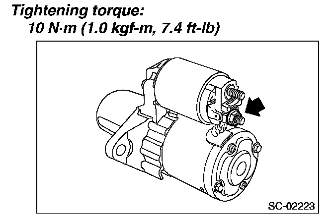 1. Loosen the nuts fastening the magnet switch assembly M terminal, then disconnect the harness from the terminal.
