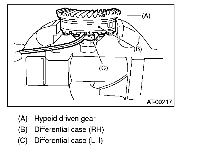^ Hold the differential case assembly by hand to avoid damaging the retainer mounting hole of the converter case.