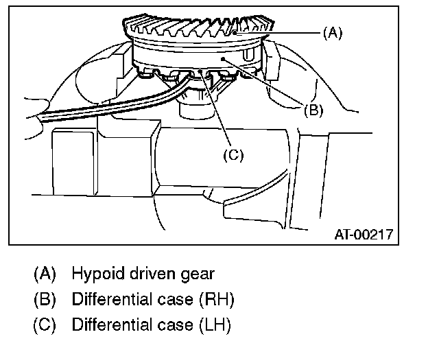 2) Secure the case in a vise, remove the hypoid driven gear tightening bolts, and then separate the hypoid driven gear into differential case (RH) and differential case (LH).