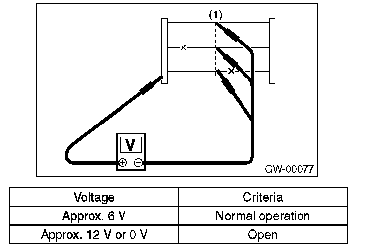 - If the measured value is 12 V, heat wire is open between heat wire center and positive (+) terminal of tester probe.