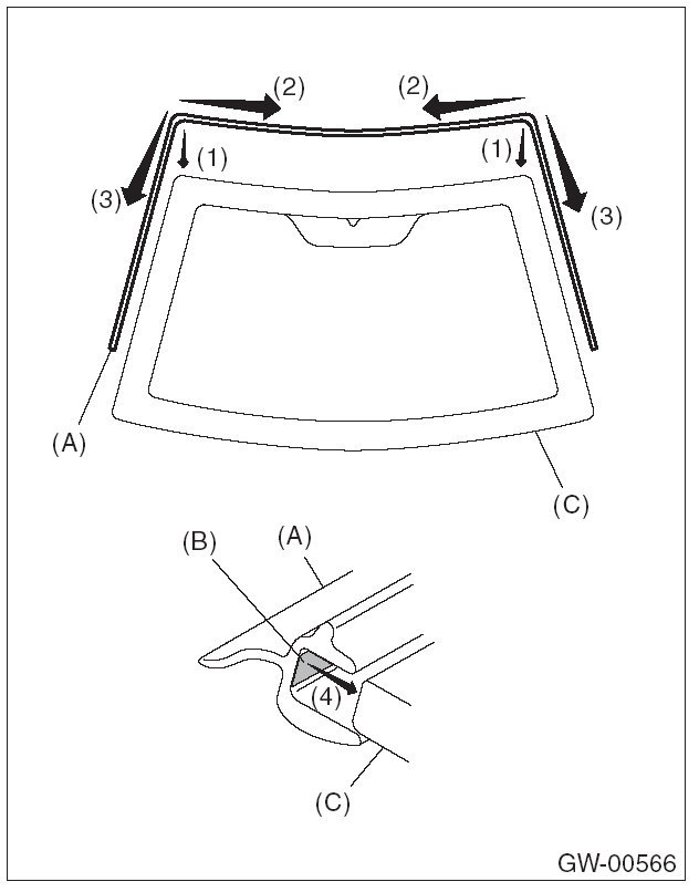 1. Align the molding (A) to the upper ends of the windshield glass (C).