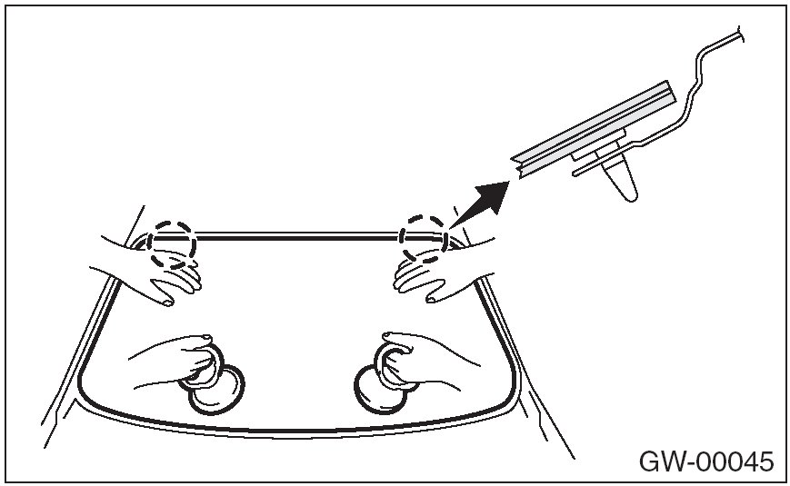 10. Using suction rubber cups, fit the locator pins into the body side, and attach the windshield glass.