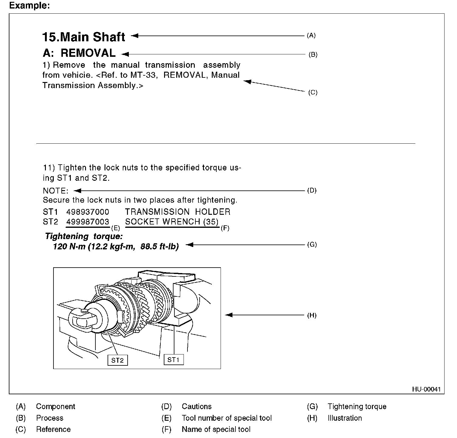 Illustrations are provided for each component. The information necessary for repair work (tightening torque, grease up points, etc.) is described on these illustrations. Information is described using symbol. To order parts, refer to parts catalogue.