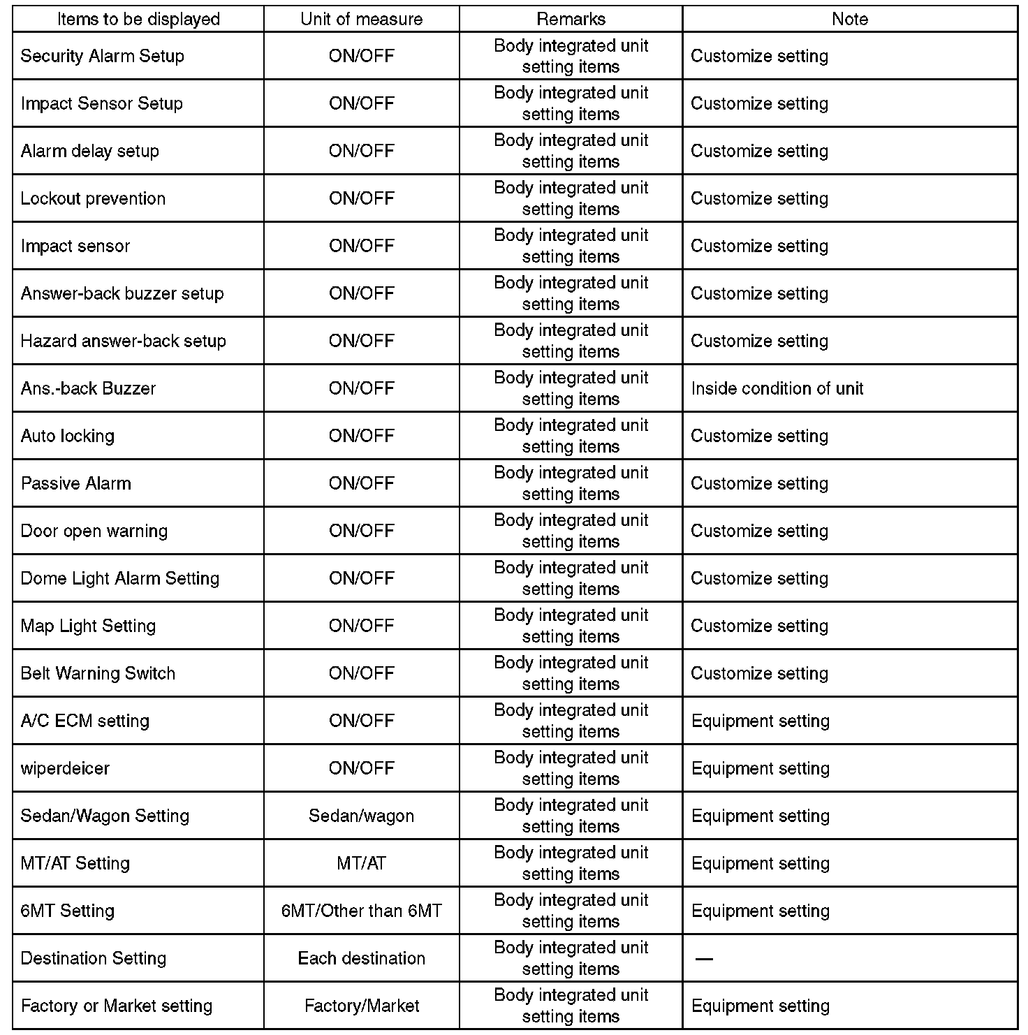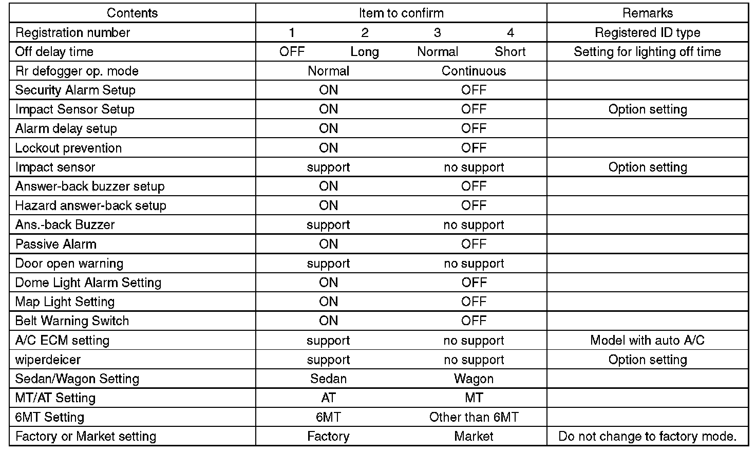 - Be sure not to change Factory or Market setting except when installing a new body integrated unit.