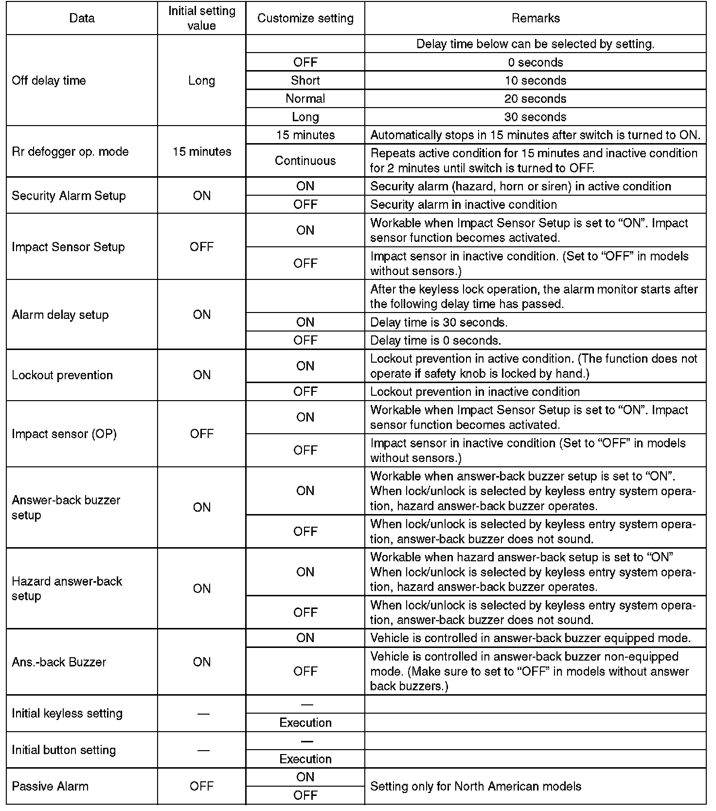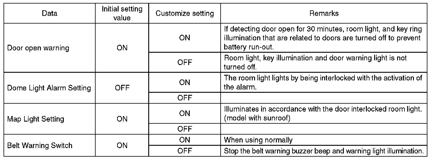 - Each settings have been set. It can be recognized by key ring illumination coming on in concocting with room light and going off with ignition switch turned to ON.