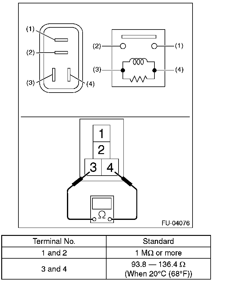 2. Connect the battery positive terminal to terminal No.3 and the battery ground terminal to terminal No.4, and measure the resistance between the electronic throttle control relay terminals.
