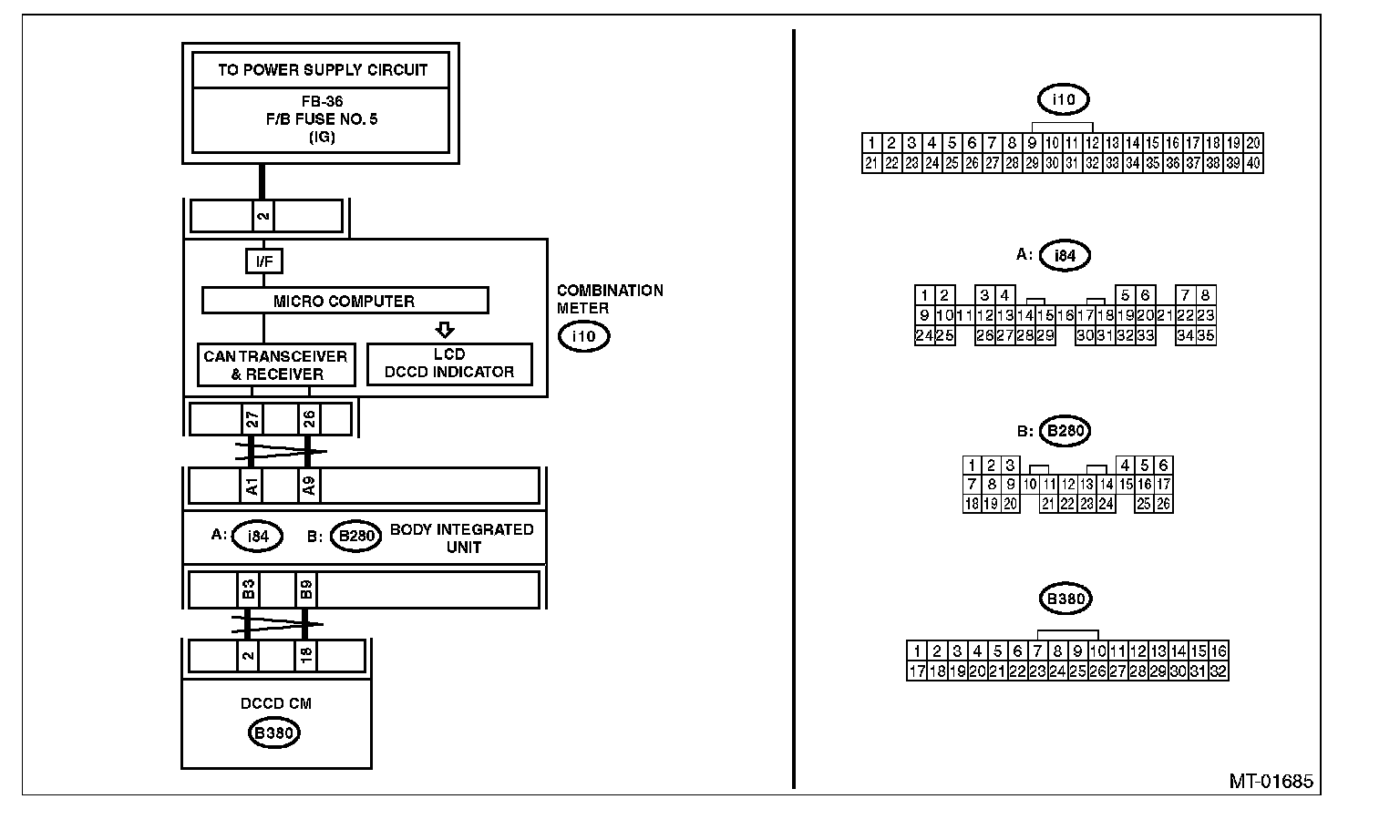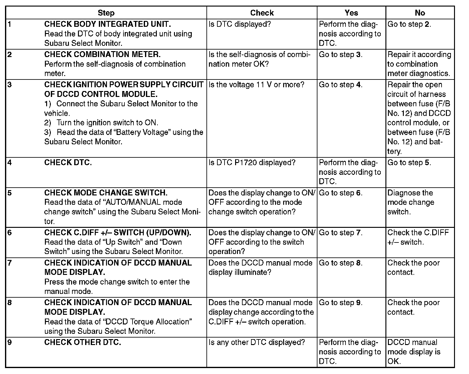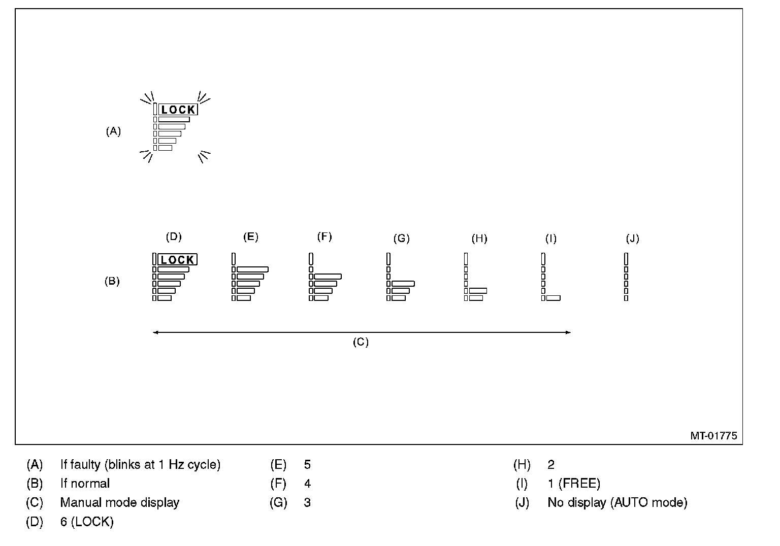When there is a problem with a part or module, DCCD manual mode display blinks. (DCCD manual mode display blinks even in AUTO mode condition.) Until the problem is detected and the ignition switch is turned OFF, the blinking continues. The faulty parts can be recognized by reading through the Subaru Select Monitor.