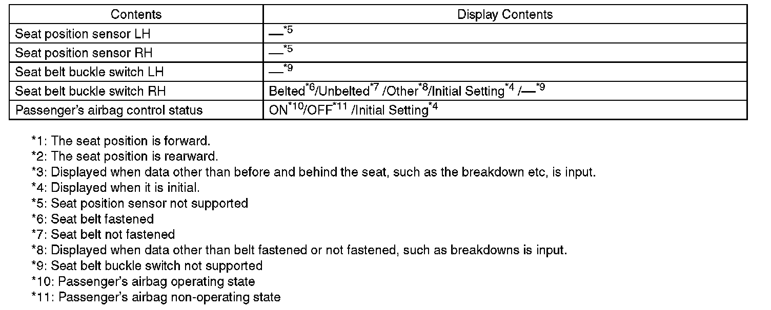 Check the operating condition of each sensor in the event of malfunction in the seat belt buckle switch and seat position sensor, or when the seat belt buckle switch and seat position sensor has been replaced.