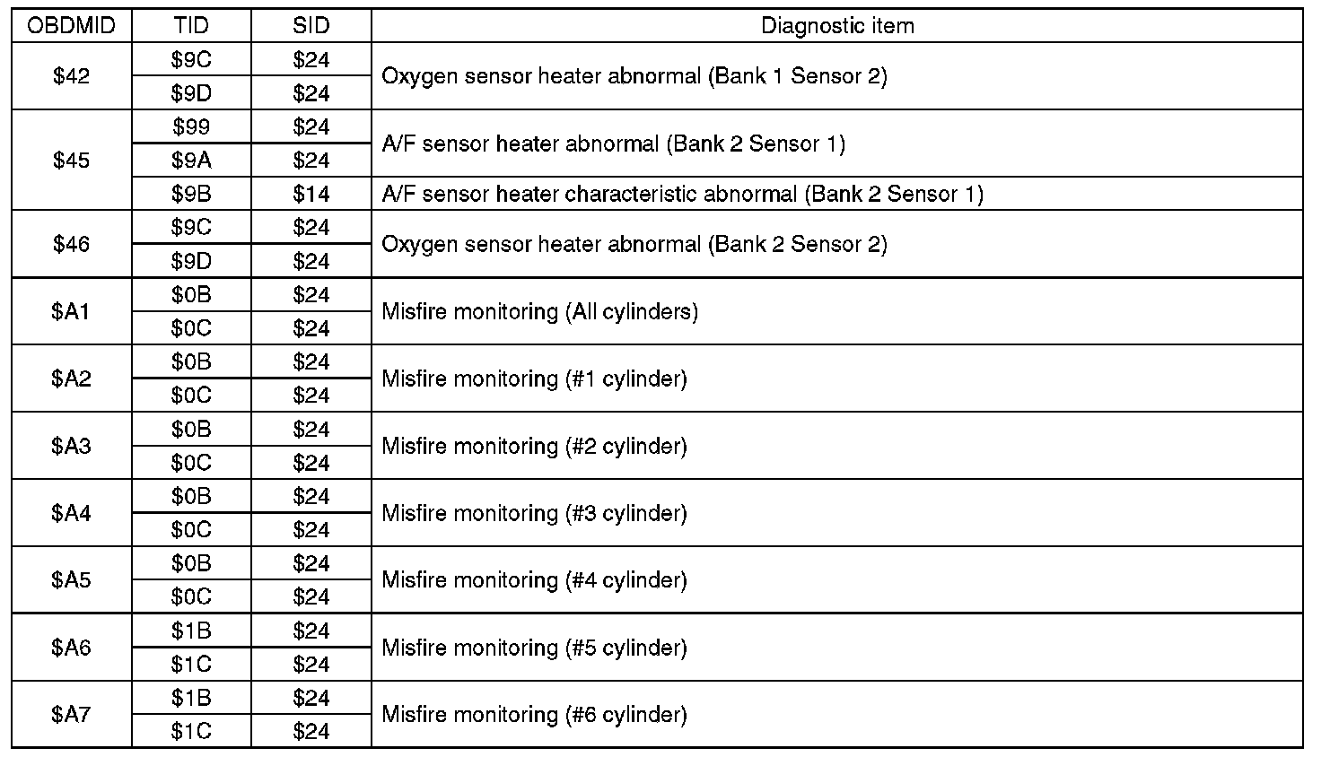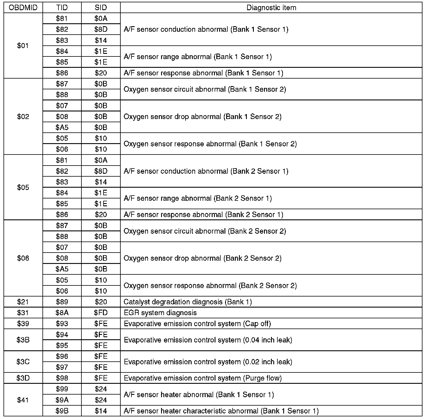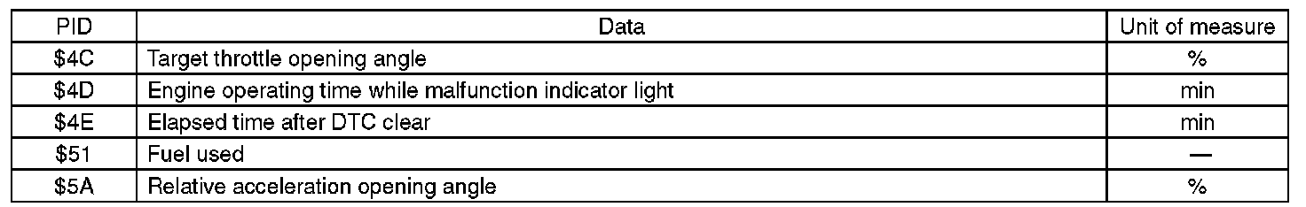 Refer to data denoting the operating condition when trouble is sensed by the on-board diagnosis system. A list of the support data and PID (Parameter Identification) codes are shown in the following table.