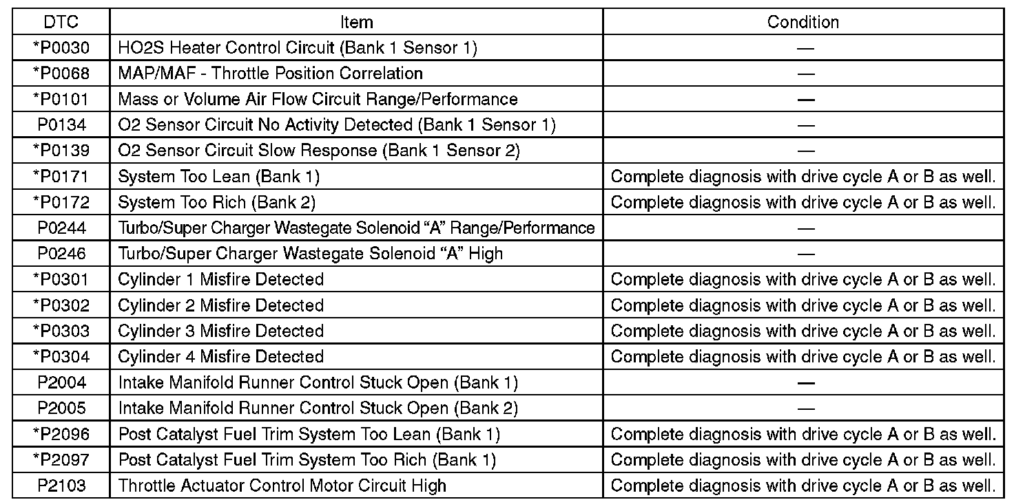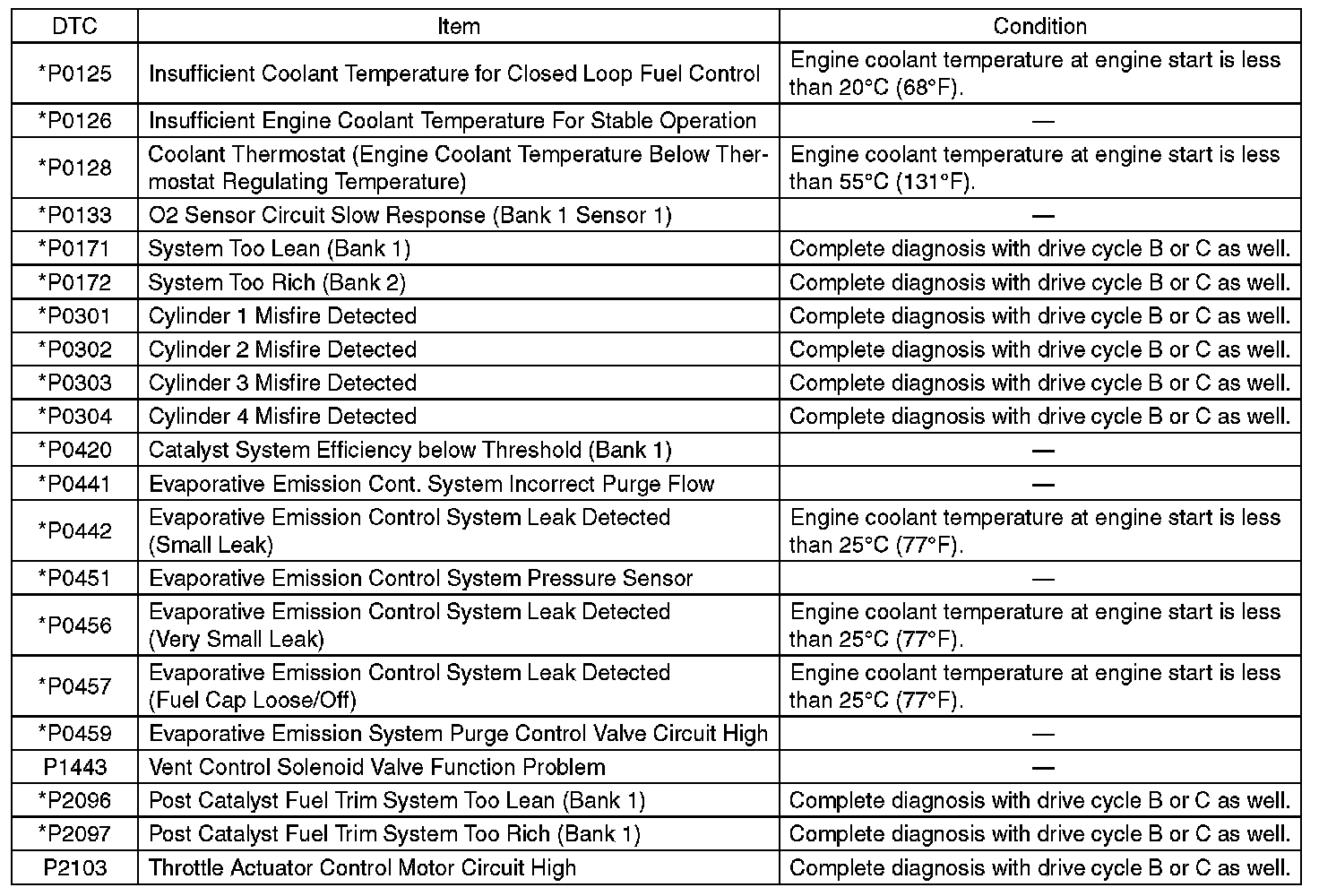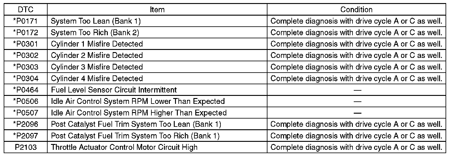 - Perform the diagnosis twice if the DTC marked with *. After completing the first diagnosis, stop the engine and perform second diagnosis in same condition.