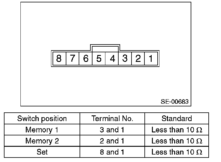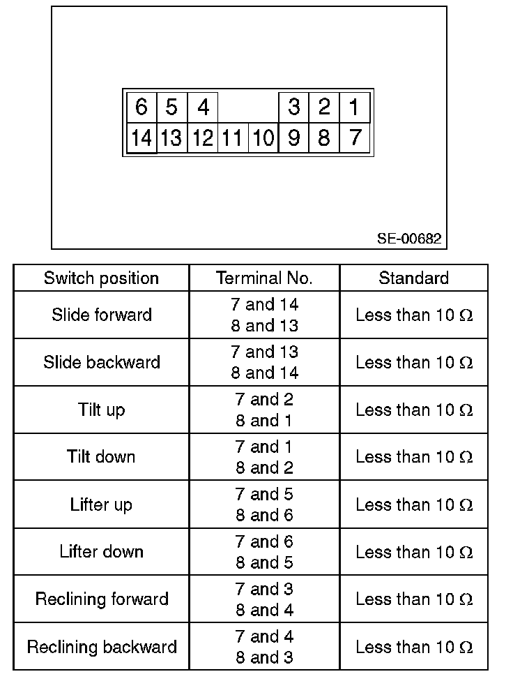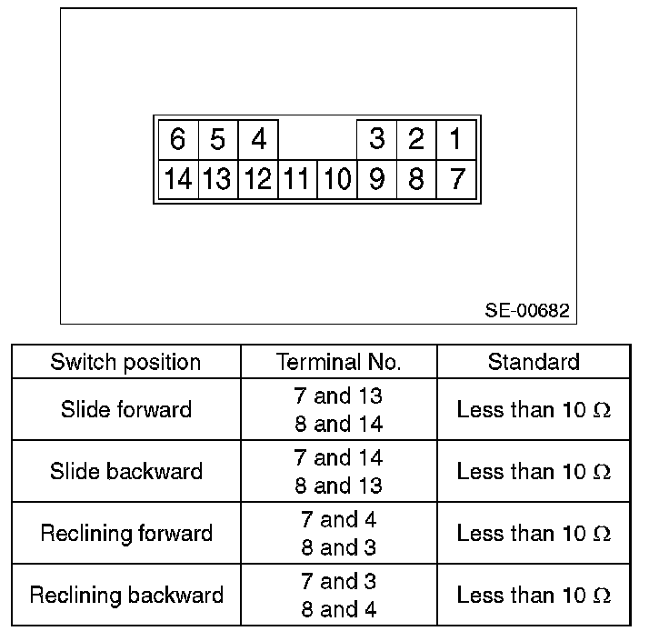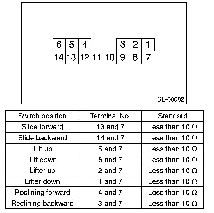 Move each switch and measure the resistance between connector terminals. Driver's seat (without memory)