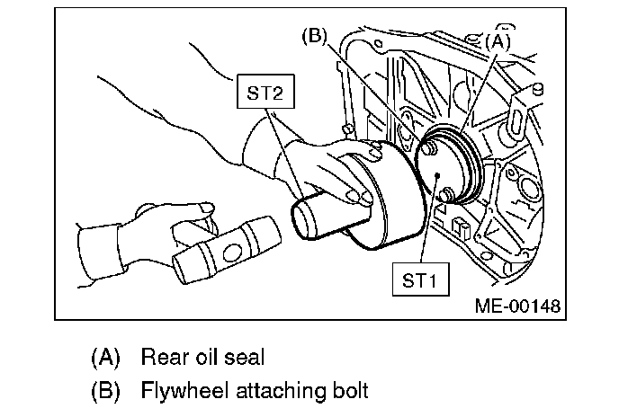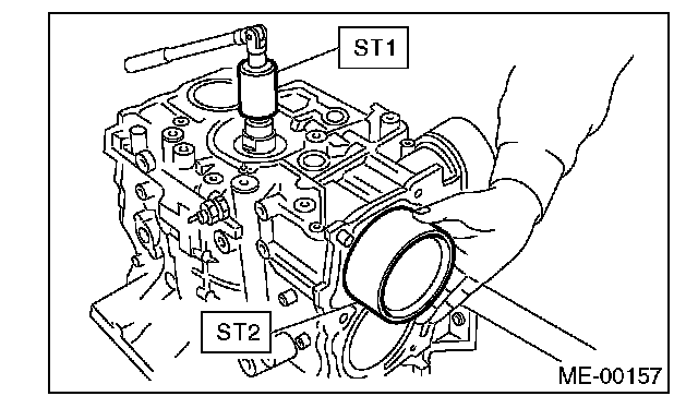 12. Apply a coat of engine oil to the oil seal periphery, then install the rear oil seal using ST1 and ST2.