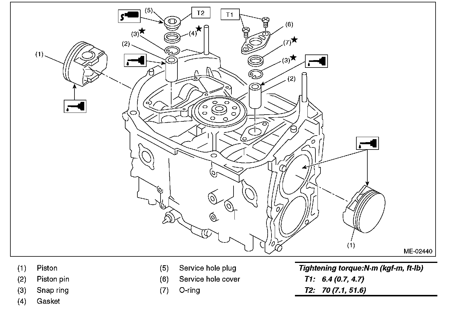 3. Apply a coat of engine oil to piston pin, and insert the piston pin into piston and connecting rod through service hole.