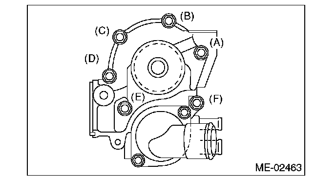 ^ When installing the water pump, tighten bolts in two stages in alphabetical order as shown in the figure.