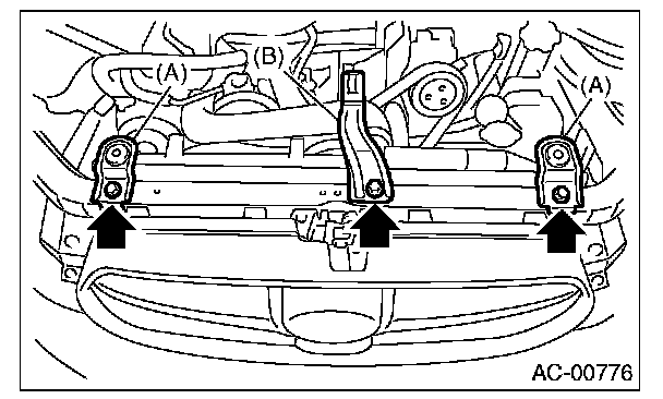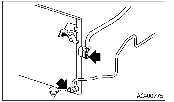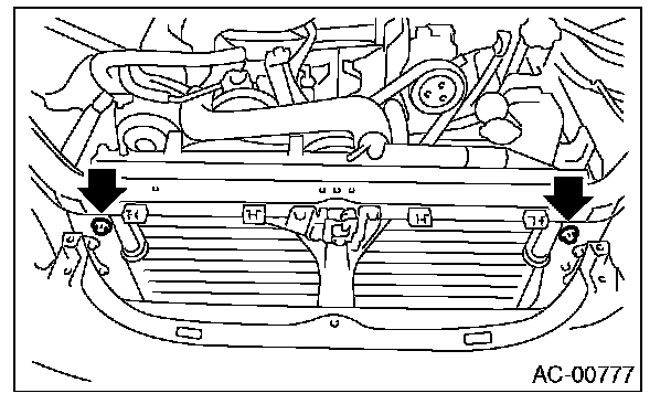 6. Remove two bolts. While lifting the condenser, pull out through space between the radiator and the radiator panel.
