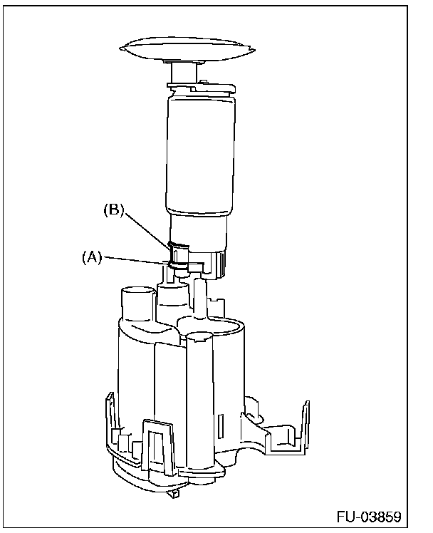 1. Assemble o-ring (A) and spacer (B) to the fuel pump, and attach the pump assembly to the fuel filter.