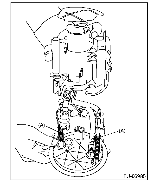3. Attach spring (A) to the metal rod of the sub tank bracket assembly, and assemble the fuel filter assembly.