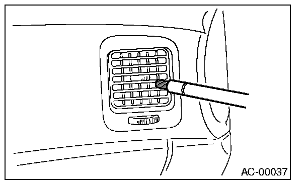 11. Turn the ignition key to the ON position, and run the blower at high speed for approx. 1 minute. Stop the blower and check the ventilation grille on the instrument panel. While moving the tester closer to the grille, run the blower for 1 or 2 seconds, then stop it. Check the grille at that position for atleast 10 seconds.
